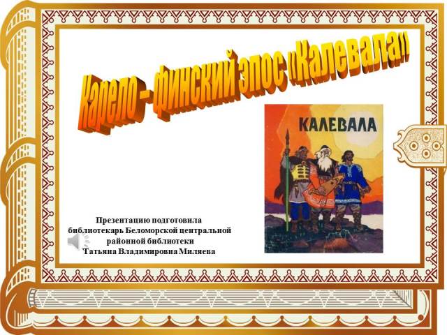 «Калевала» –карело-финский поэтический эпос, национальное достояние Финляндии и Карелии, признанное уникальным народным эпосом, не имеющим аналогов в мировой литературе. «Калевала» - великая поэма Севера, она является эстетическим памятником и фактом истории народа. Предлагаем вашему вниманию презентацию, подготовленную Татьяной Владимировной Миляевой, сотрудником Беломорской районной библиотеки.