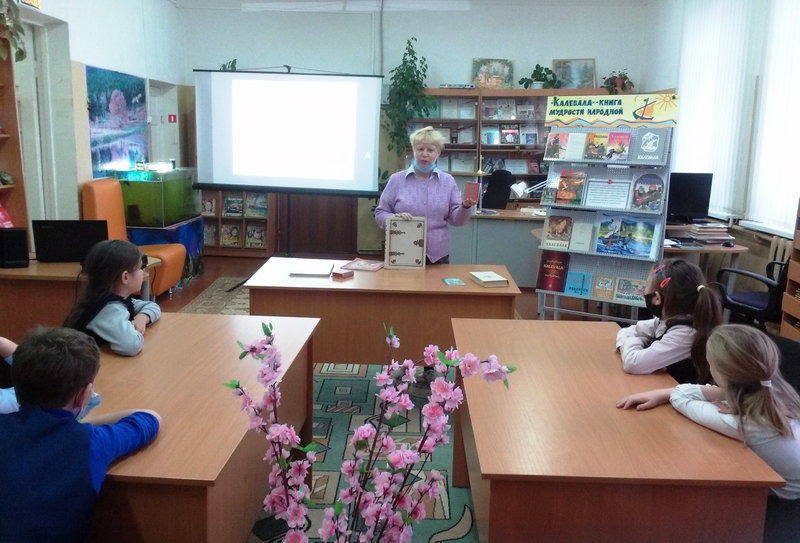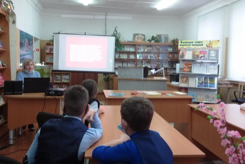 2021 год объявлен Годом карельских рун. Мы пригласили учащихся 3 класса (учитель С.Г. Сухомлинова) в библиотеку для знакомства с карело-финским эпосом «Калевала». Из показанной презентации школьники узнали о создателе «Калевалы» Элиасе Леннроте, неутомимом собирателе народных песен. Библиотекарь познакомила с основным сюжетом, связанным с историей создания мельницы Сампо и борьбы за нее, а также с эпизодами похищения солнца и луны и их освобождения. Также ребята познакомились с главными героями поэмы - мудрым Вяйнямейненом, кузнецом Илмариненом, веселым охотником Лемминкяйненом и злой старухой Лоухи. Дети посмотрели отрывок из кинофильма «Сампо», снятого по мотивам эпоса.